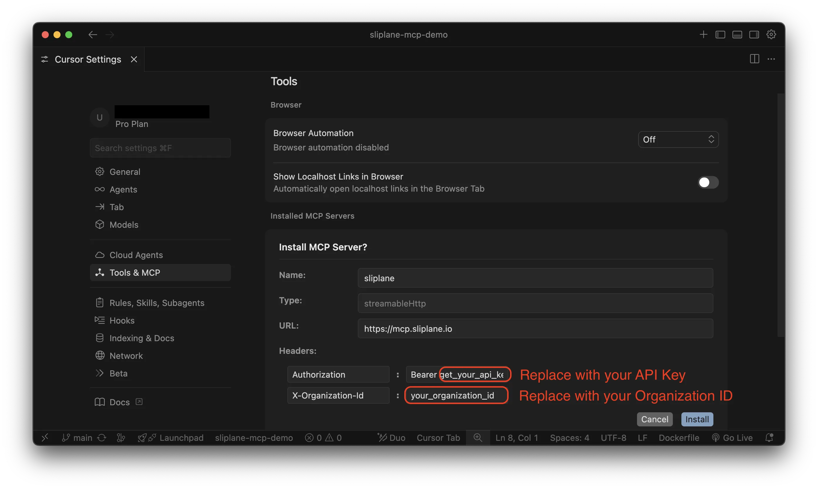 Cursor will open the install flow and open the configuration page for you. All you need to do is to paste your API key and Organization ID.